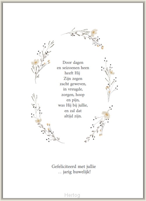 - Enkele kaart met envelop Formaat: 105 x 148 mm. Opdruk: Gefeliciteerd met jullie ... jarig huwelijk! Door dagen en seizoenen heen heeft Hij Zijn zegen zacht geweven, in vreugde, zorgen, hoop en pijn, ... Meer